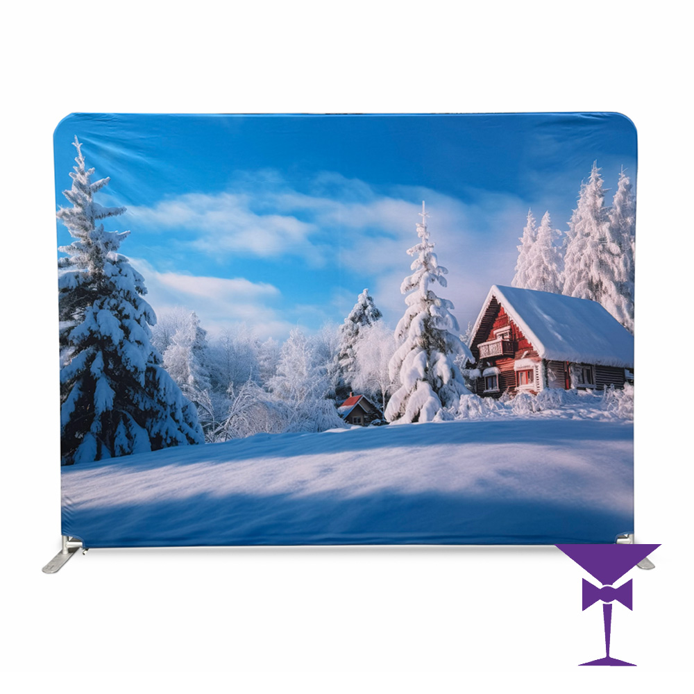 Transform your event space into a picturesque mountain retreat with our Alpine Lodge Backdrop. This snow-dusted scene features a cozy timber cabin nestled among towering pine trees, all blanketed in fresh powder under a crisp blue sky. The soft sunlight and untouched snow give the look of tranquility of a remote alpine getaway