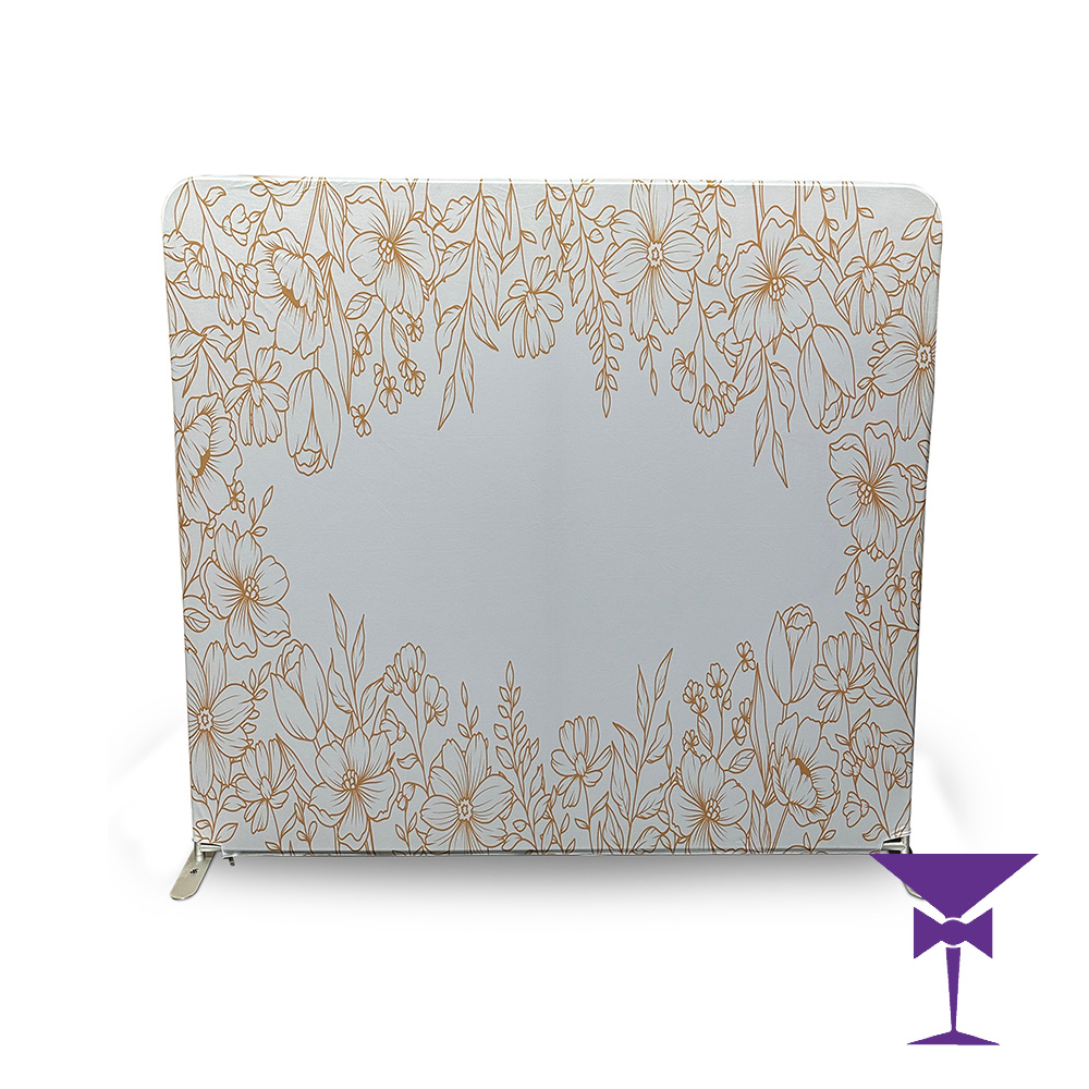 Elegant and understated, our Gold Floral Backdrop Hire adds a touch of luxury to any wedding or event. Featuring delicate, golden-illustrated blossoms and foliage arranged around a soft, neutral centre, this freestanding stretch backdrop is ideal for creating an instaworthy photo moment.