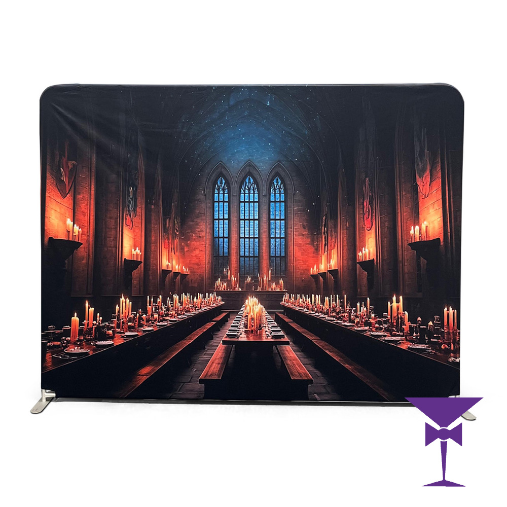 Transport your guests straight into the heart of Hogwarts with our immersive Great Hall Backdrop. Featuring long banquet tables, floating candles, and an enchanted ceiling under moonlight, this richly detailed scene sets the stage for magical photo ops and themed events.