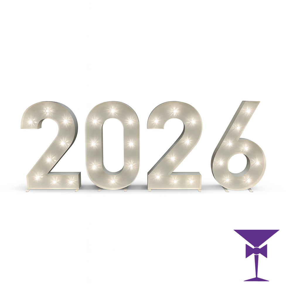 Celebrate the new year or mark a milestone with our stunning 4ft-tall 2026 LED numbers, available for hire across Surrey, Sussex, London, and Kent. Each number is fabricated in a sleek white gloss finish and fitted with warm white LED bulbs, creating a radiant glow perfect for parties, corporate events, graduations, and New Year’s Eve celebrations.