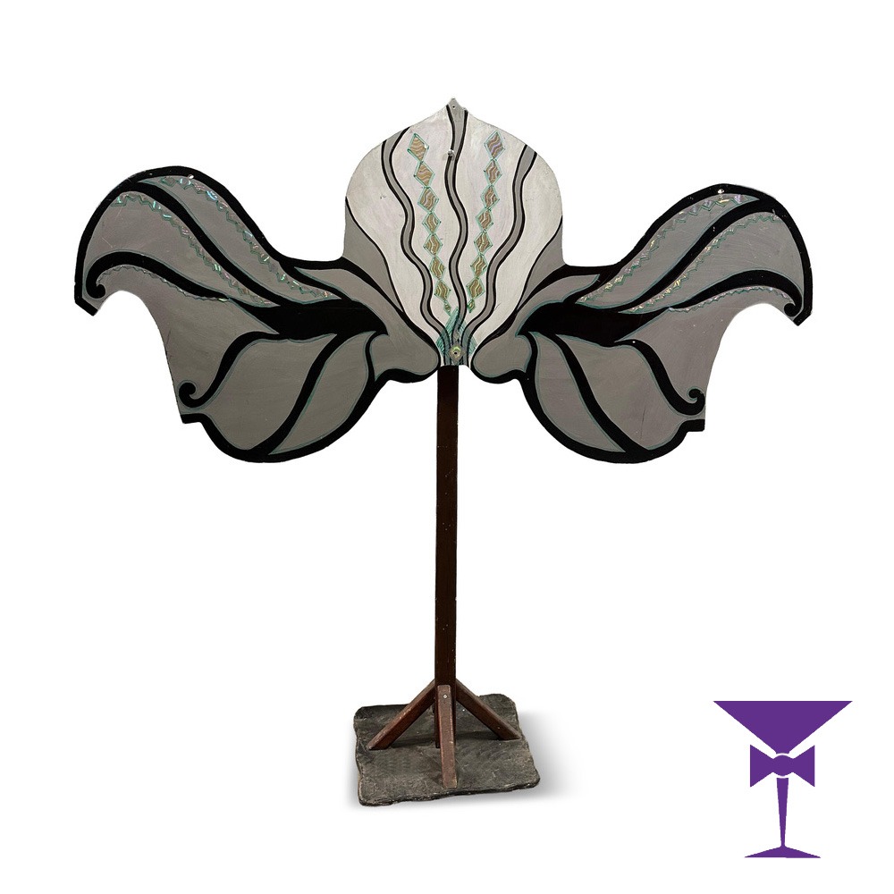Hand made with a butterfly‑like silhouette shape, the mask features layered black, white, and silver colours with metalic patterms, giving it a dramatic presence under event lighting. Whether positioned at an entrance, next to a stage or used as part of a larger themed installation, it brings instant