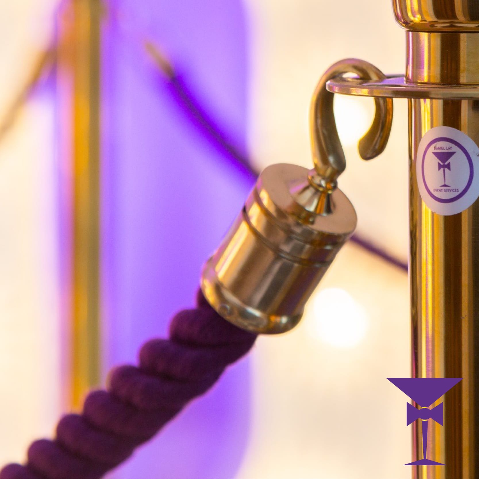 Purple twist stanchion rope with Gold hooks for hire. Our barrier ropes are perfect for roping off products, queuing and also to compliment a carpet. Each rope is between 1.3-1.5 metres long.