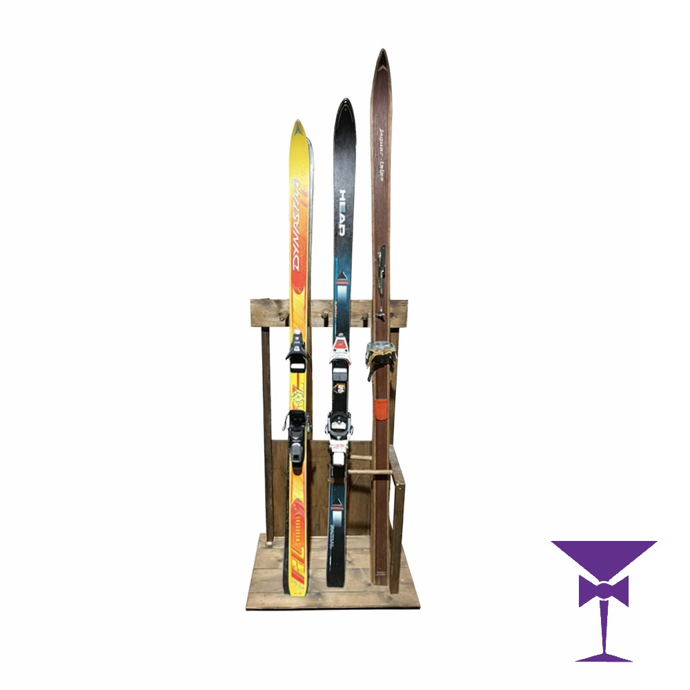 Add a touch of alpine nostalgia to your event or photoshoot with our freestanding wooden ski rack, complete with a selection of 3 retro skis. This rustic display features four iconic ski brands such as. Dynastar, Head, Rossignol, and Jarvine Lux, each showcasing bold vintage graphics and classic bindings.